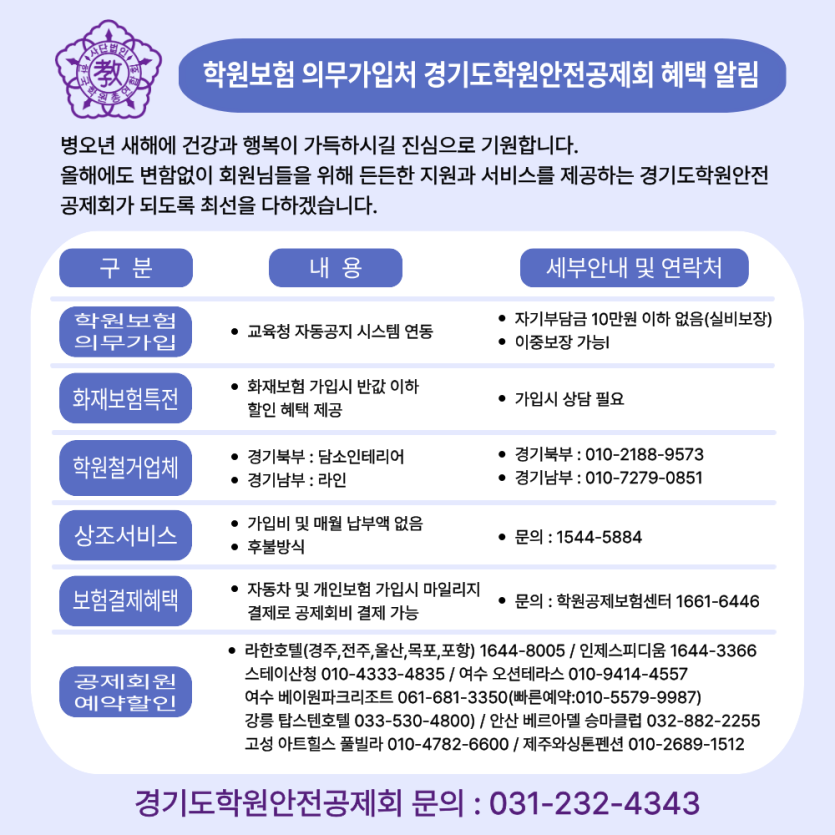 사단법인 경기도학원안전공제회에서는 회원님들의 복지증진을 위해서 다음과 같이 복지서비스를 제공해드리오니 많은 이용바랍니다.